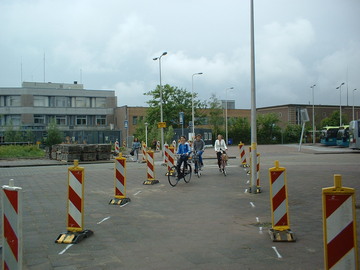 Fietsers slingeren zich een weg over het tijdelijke busstation