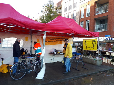 Stand van Fietsersbond op zaterdagmarkt in Boskoop,